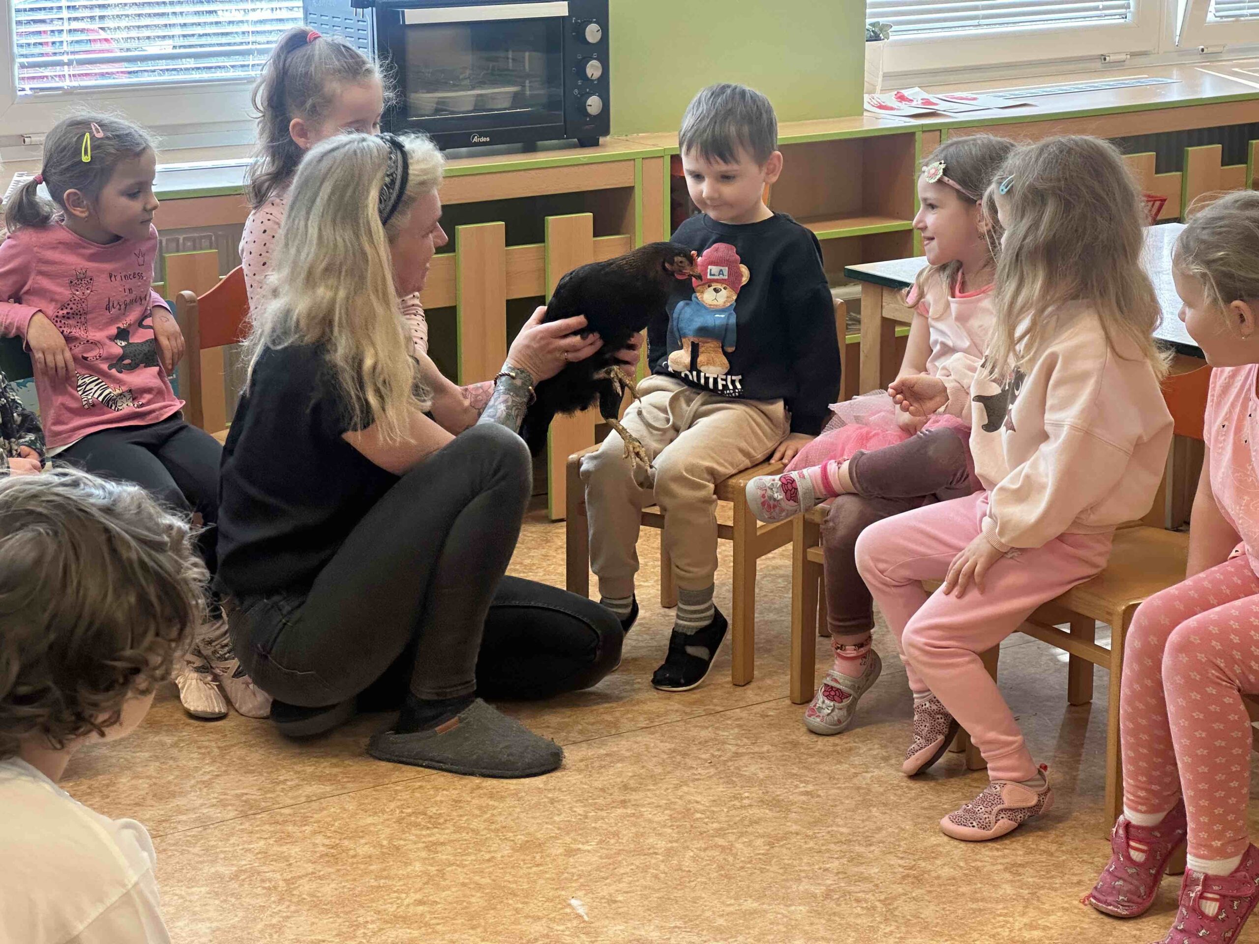 🐥 Návštěva živé slepičky : Velkým zážitkem pro děti byla návštěva živé slepičky přímo ve školce. Děti si ji mohly prohlédnout, dozvěděly se, jak žije a co potřebuje, a některé měly i možnost si ji pohladit.