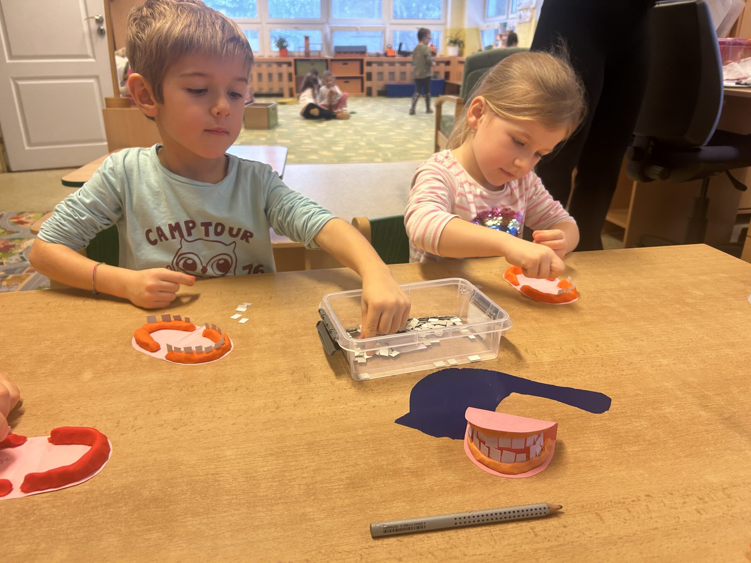Další tři týdny patřily poznávání lidského těla. Povídali jsme si o tom, co našemu tělu dělá dobře a jak o něj správně pečovat. Procvičovali jsme jemnou motoriku při práci s modelínou a při výrobě zubu, učili se básničky a objevovali spoustu nových a zajímavých informací. Nechyběla ani hudba –  zahráli jsme si na rytmické nástroje a společně vytvořili malou školkovou kapelu.