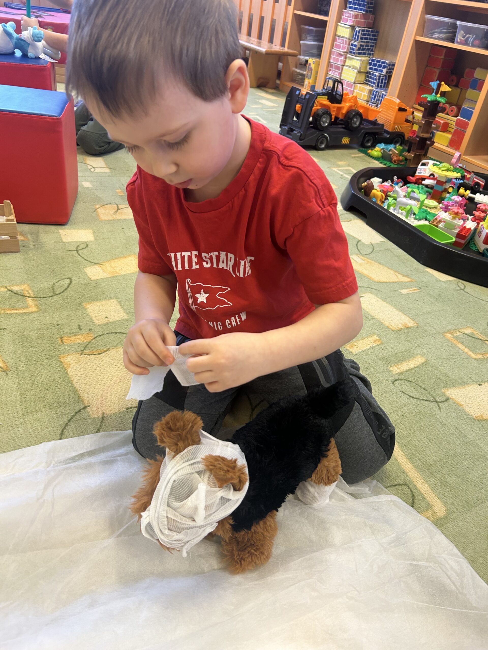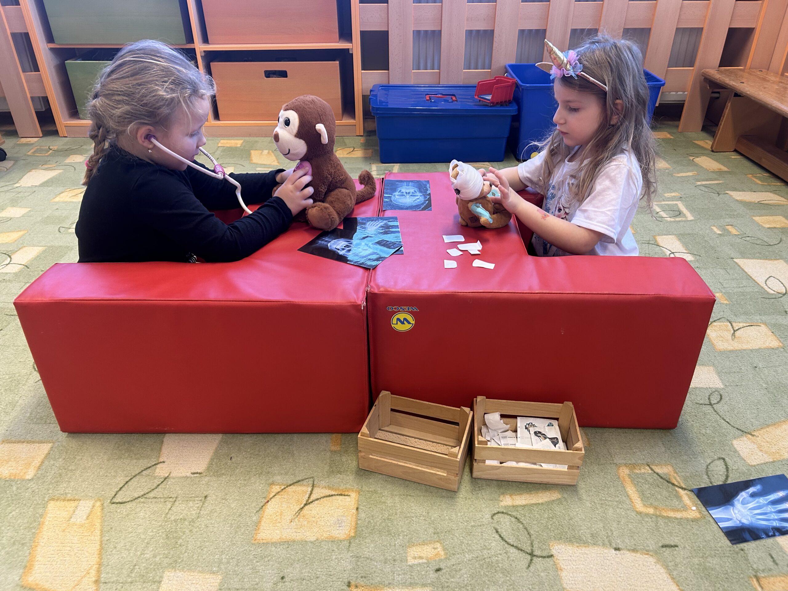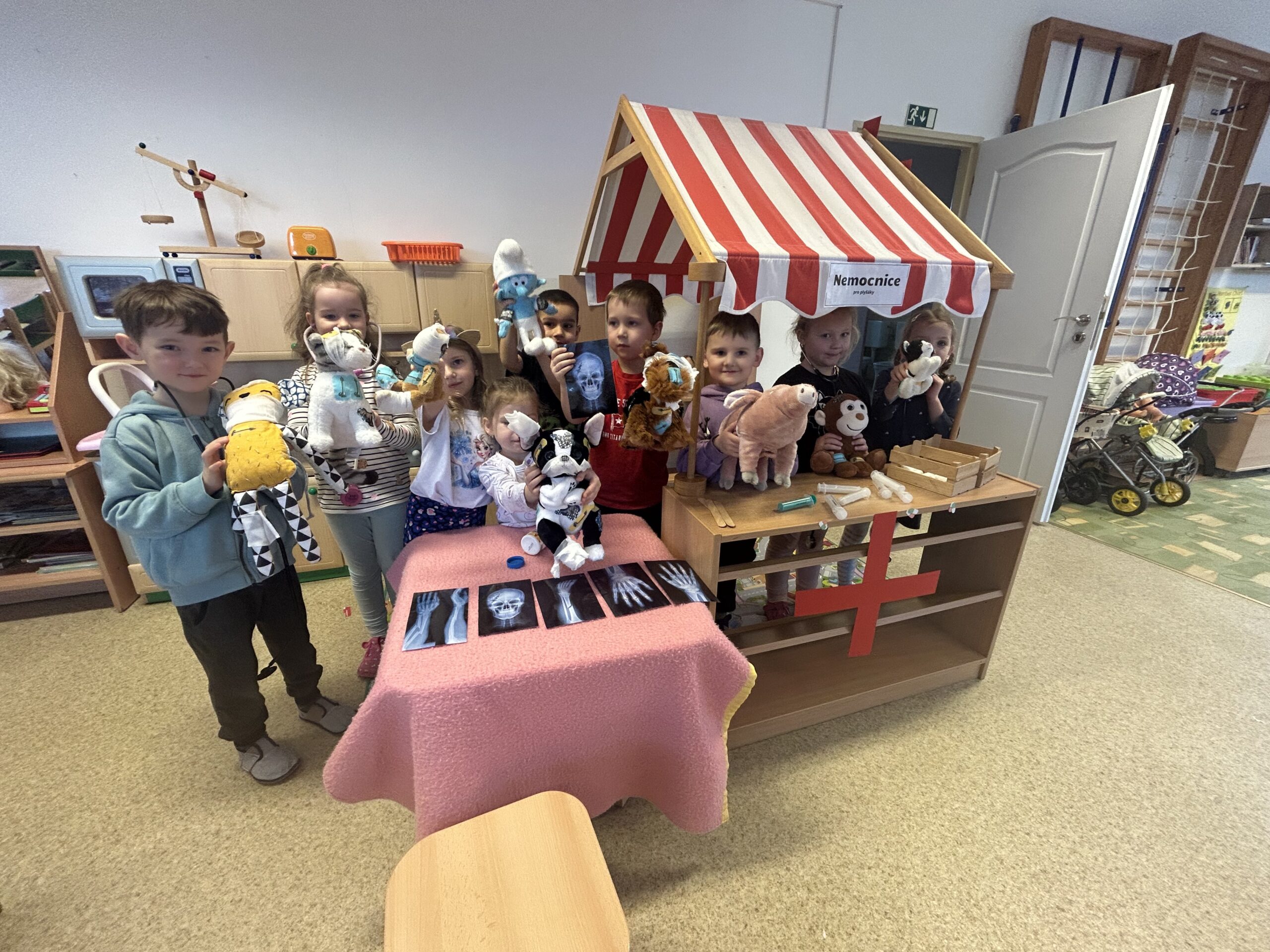 Jeden den se naše třída proměnila v opravdovou nemocnici pro nemocné plyšáky. Z dětí se stali pečliví lékaři – plyšáky obvázaly, daly jim injekci a nakonec je poslaly i na rentgen. Díky jejich starostlivé péči byli všichni pacienti brzy zase v pořádku.